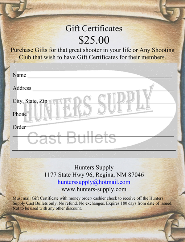 Purchase the perfect gift with a gift certificate of $25.00 for any of Hunters Supply Cast Lead Bullets or Big Bore Airgun Bullets.